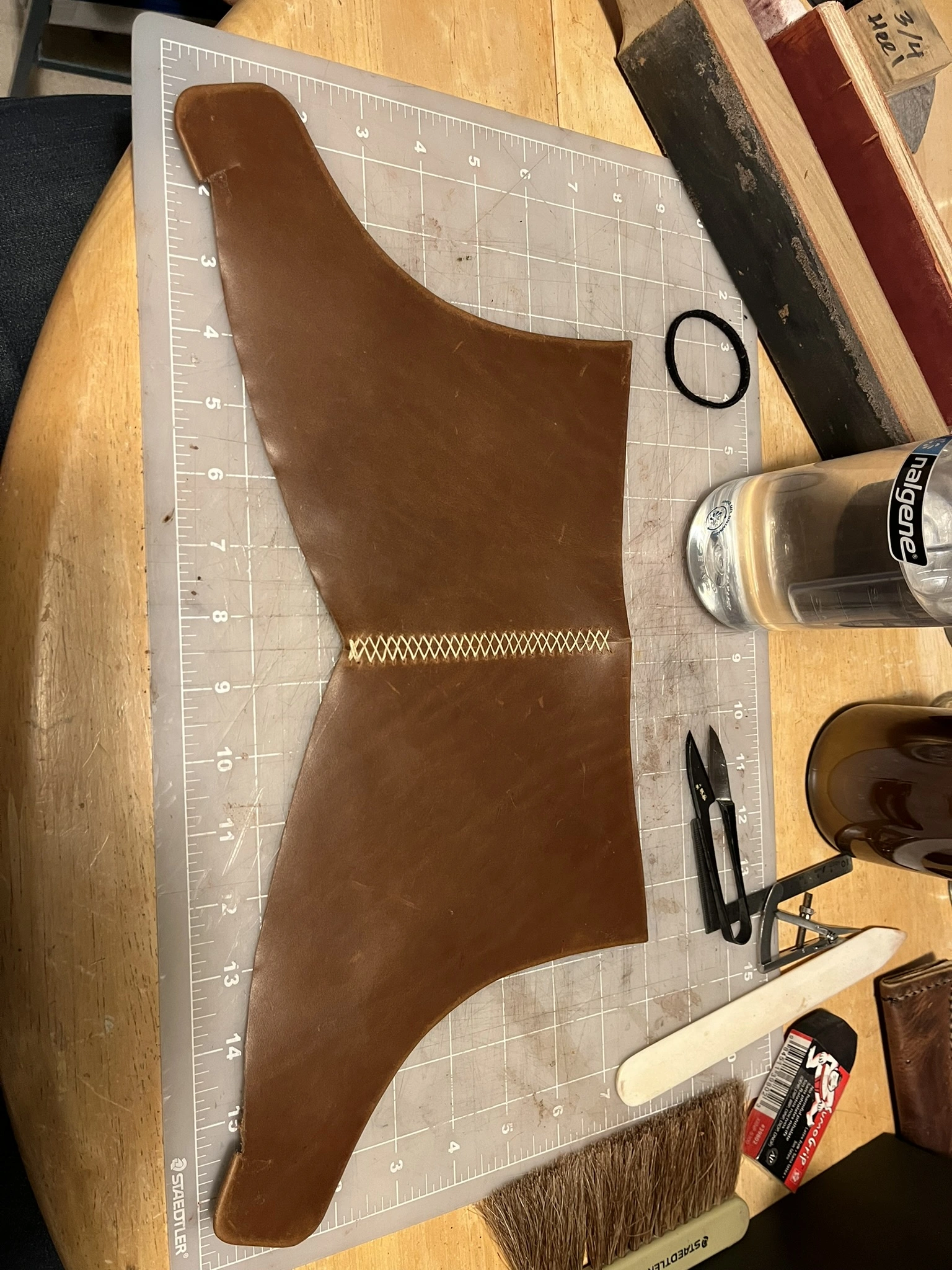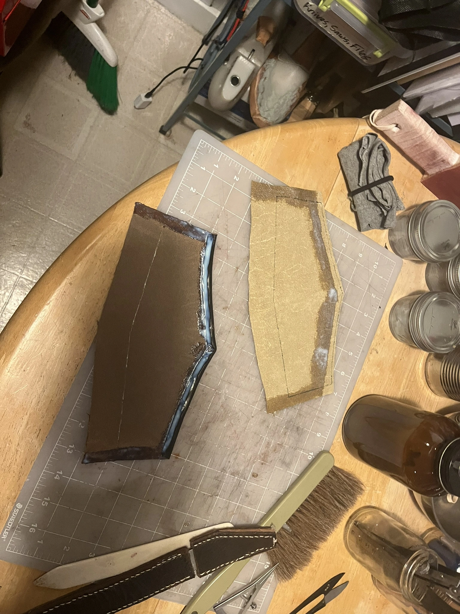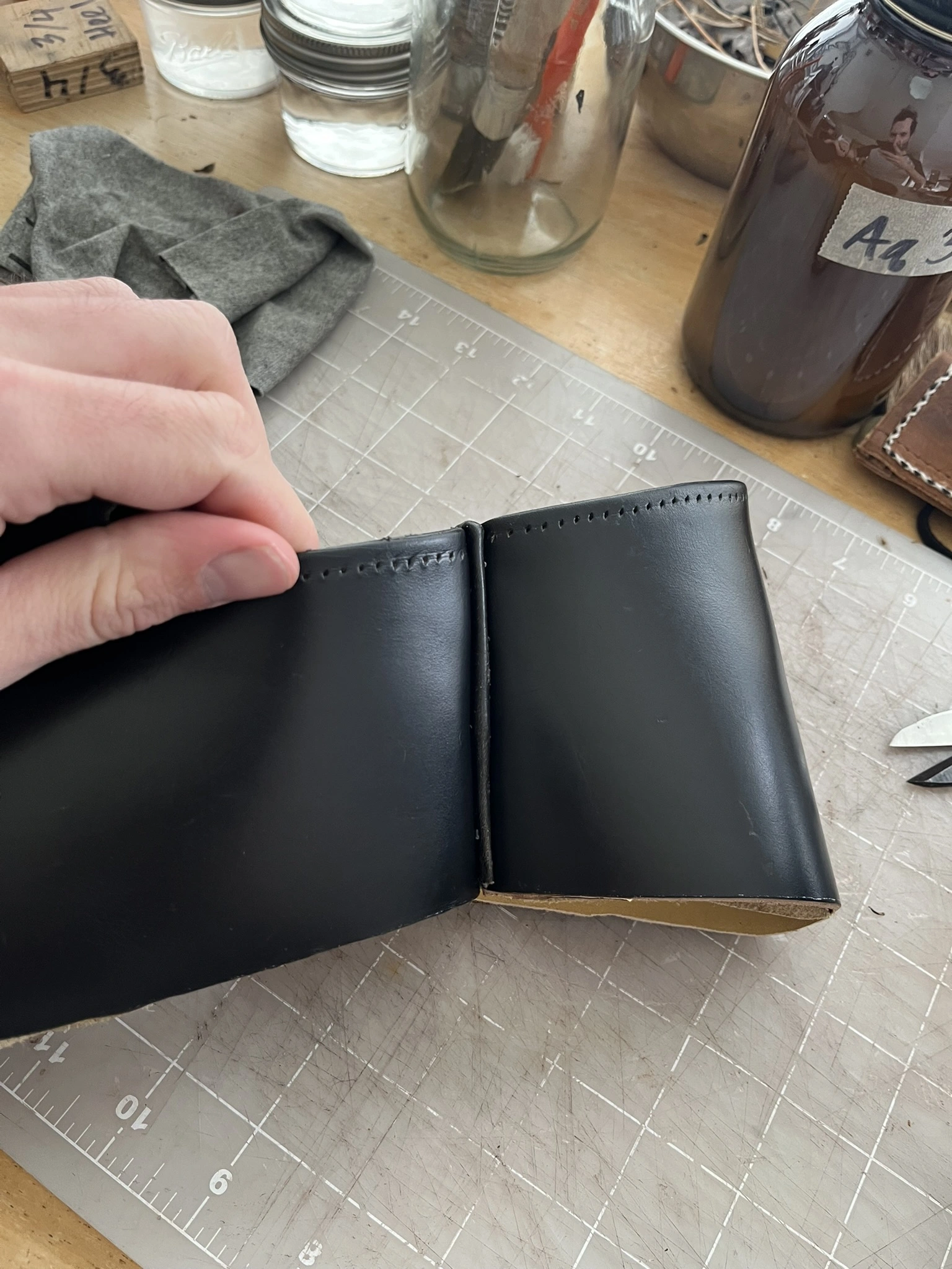 For smoother interiors, I should have just pasted the quarters temporarily using a strip of fabric and relied on the cement and stitching of the backstraps for strength.