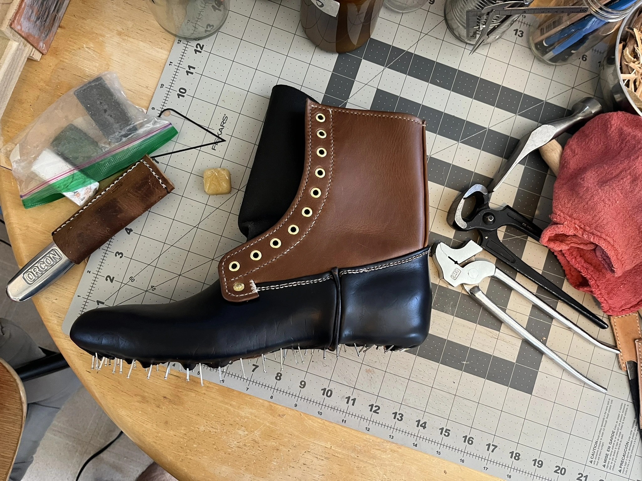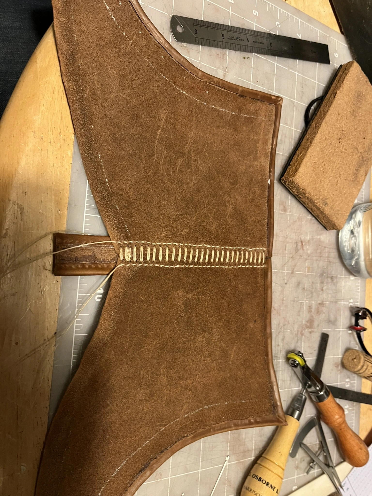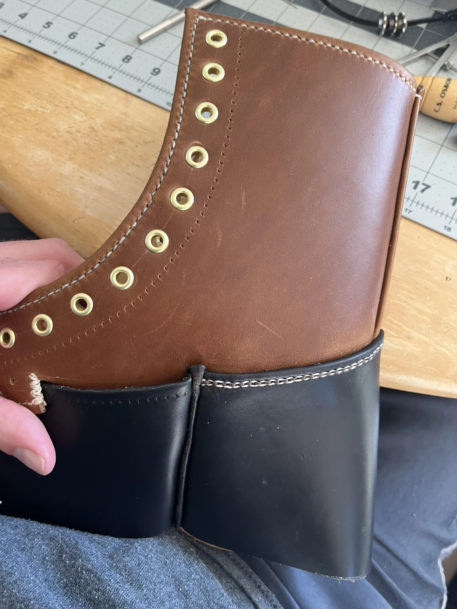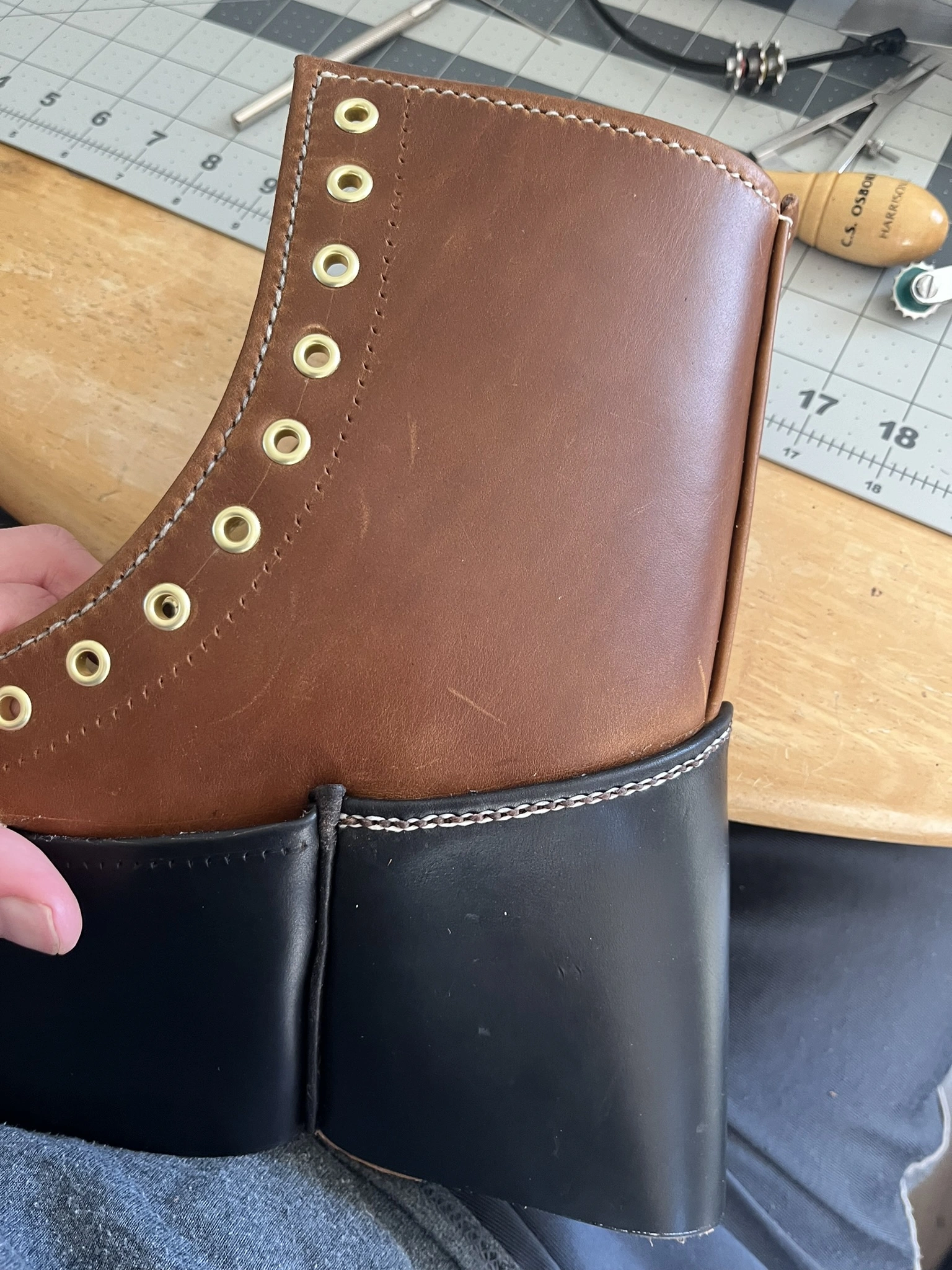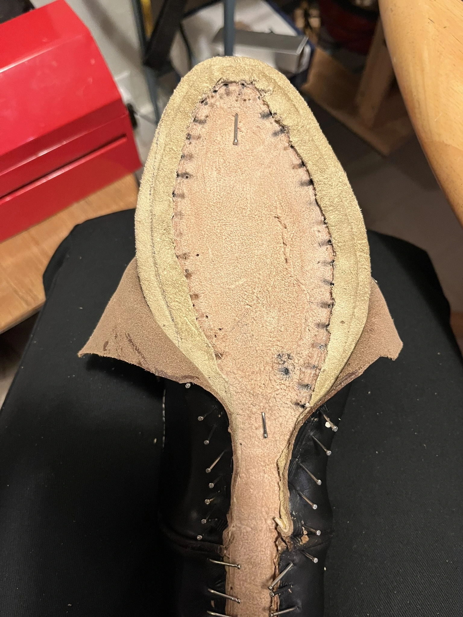 I got very, very close in the end. But I spent a lot of time retracing steps and measuring things on the shoe that got ahead. I also just plain skipped looking at my own notes on the thread I’d used on the quarters, mis-remembered, and had to pick and restitch to match.
