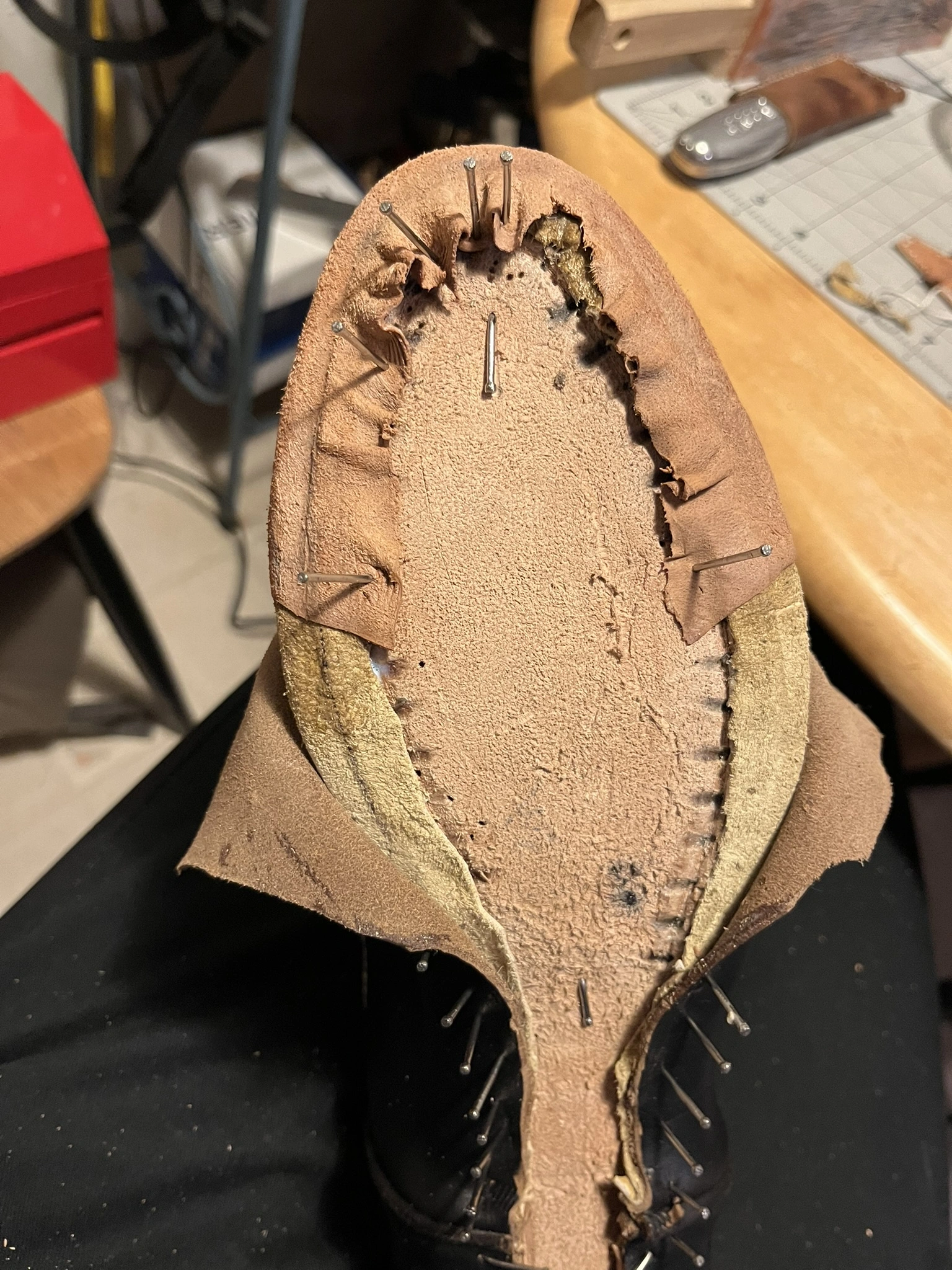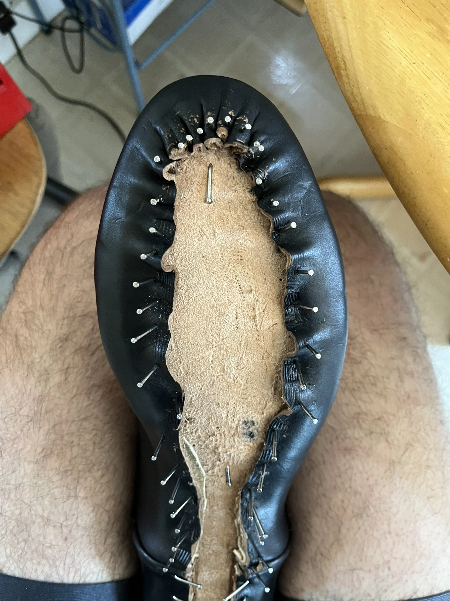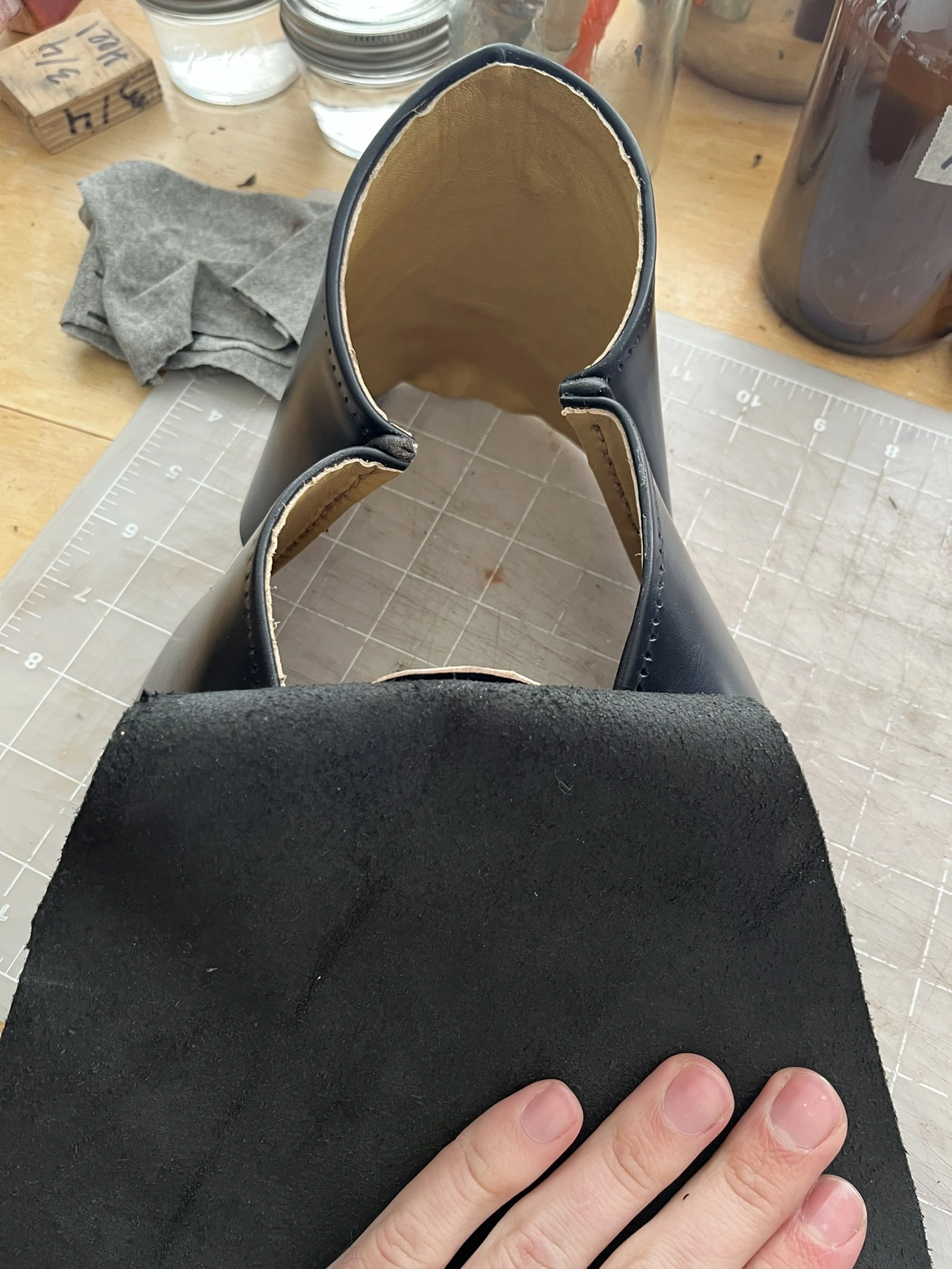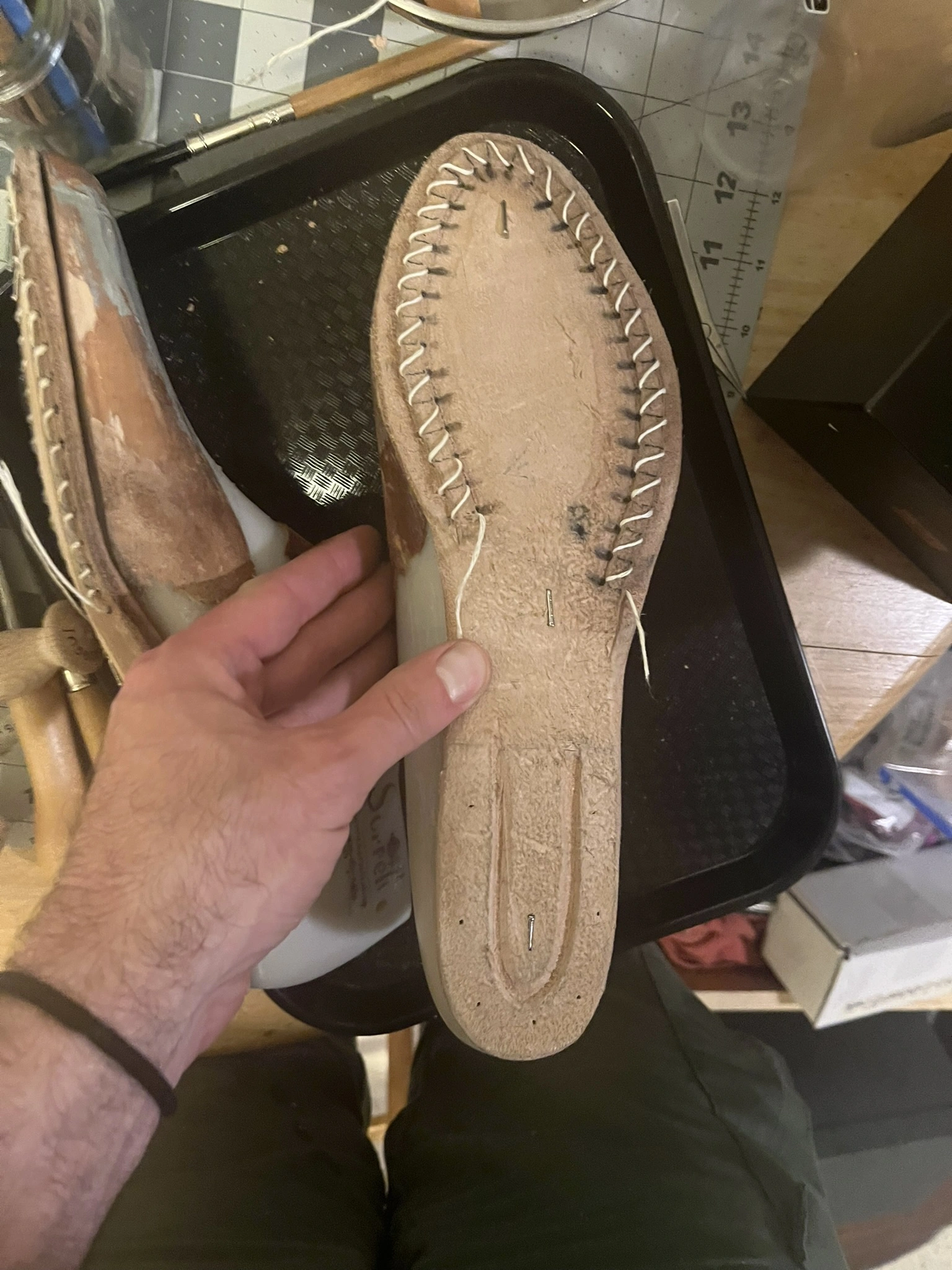 I got very, very close in the end. But I spent a lot of time retracing steps and measuring things on the shoe that got ahead. I also just plain skipped looking at my own notes on the thread I’d used on the quarters, mis-remembered, and had to pick and restitch to match.