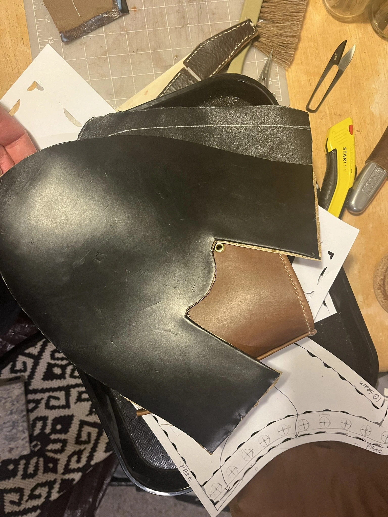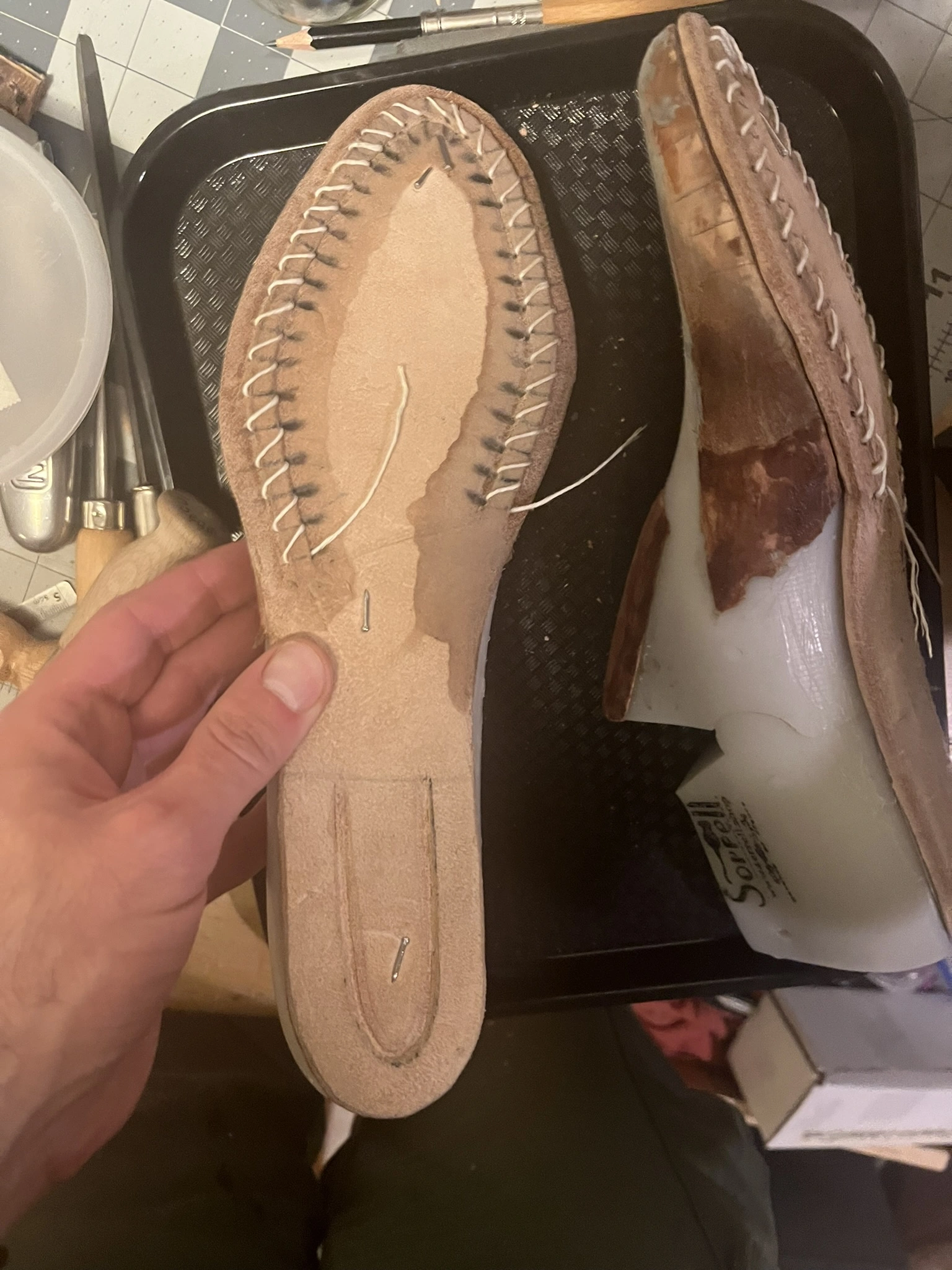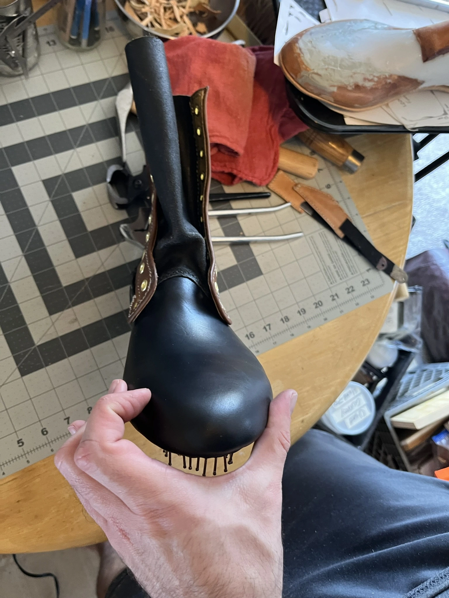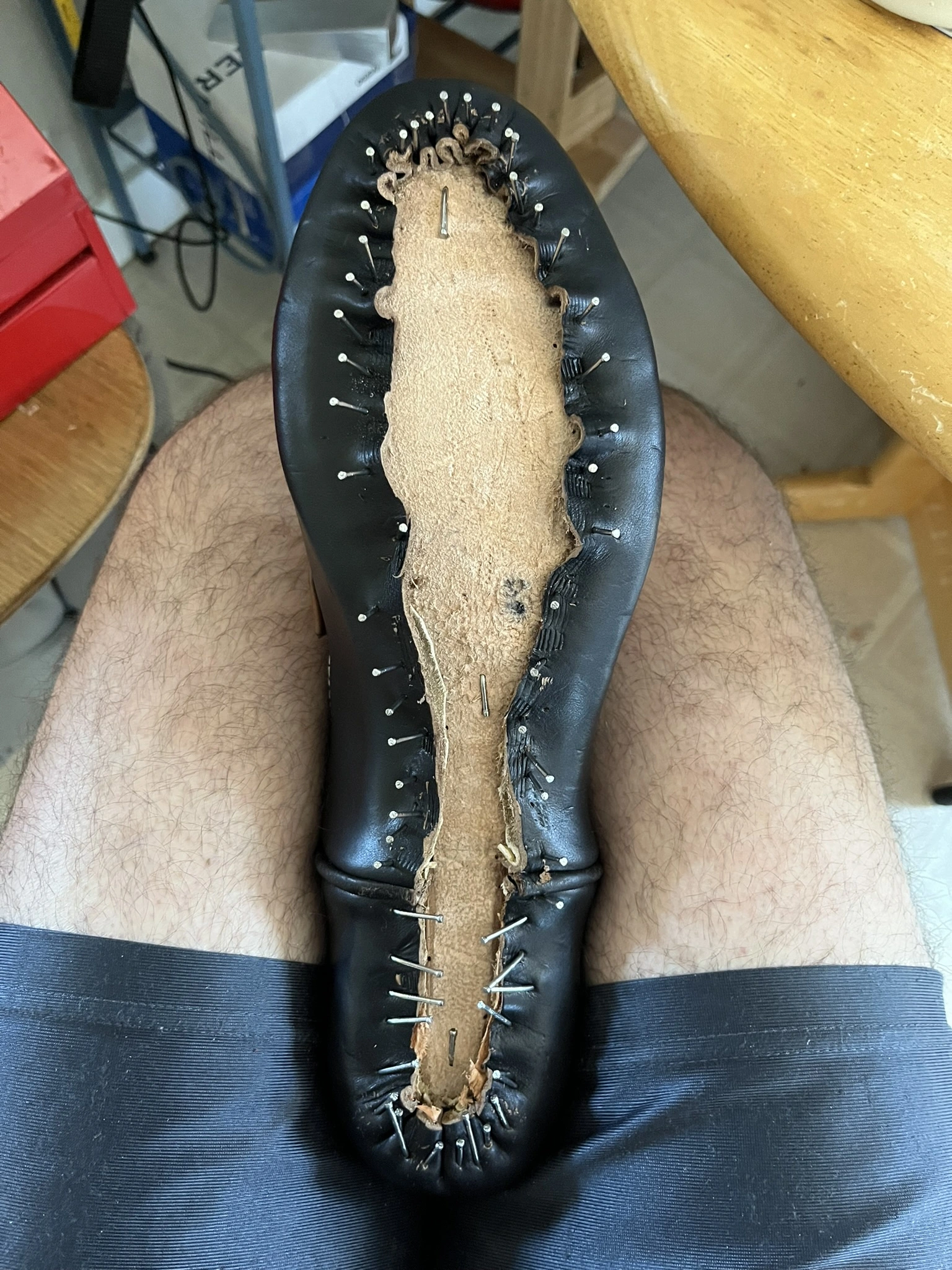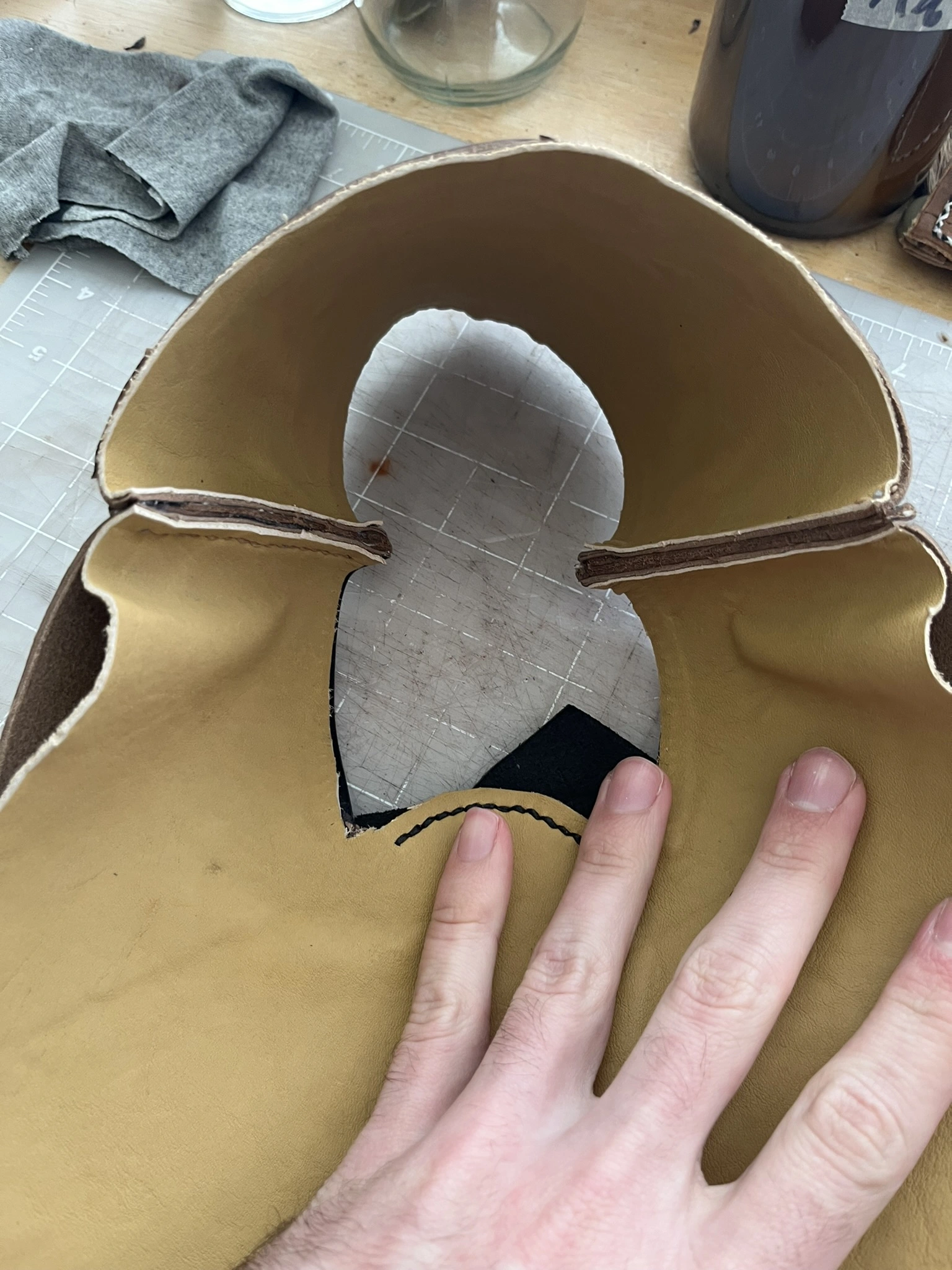 I got very, very close in the end. But I spent a lot of time retracing steps and measuring things on the shoe that got ahead. I also just plain skipped looking at my own notes on the thread I’d used on the quarters, mis-remembered, and had to pick and restitch to match.